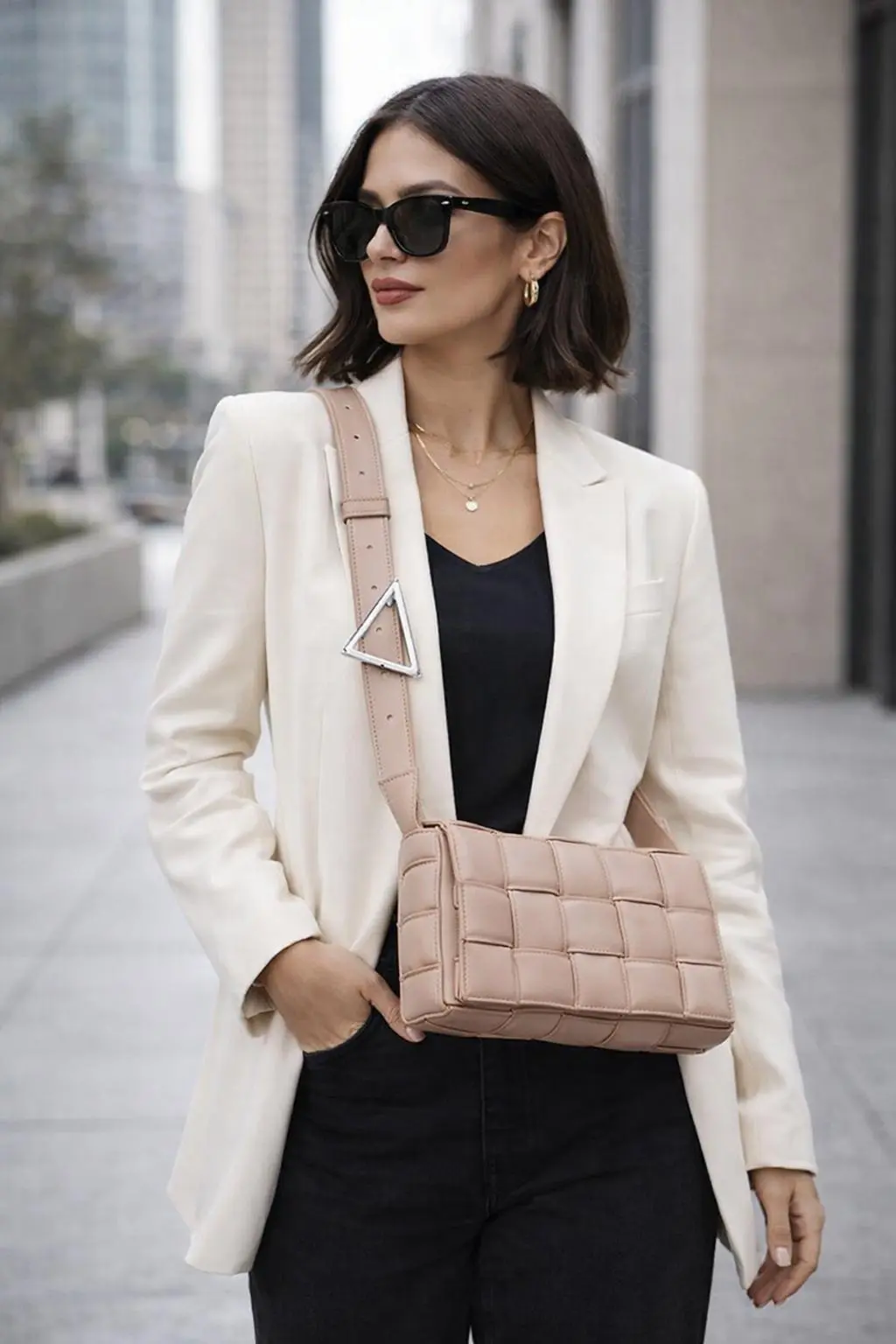 La Bandolera Lusitana presenta una silueta rectangular definida por un patrón de entrelazado geométrico («intrecciato») que cubre frontal, base y laterales. Este diseño aporta una textura tridimensional y refuerza la estructura del bolso, manteniendo su forma incluso con carga interna.